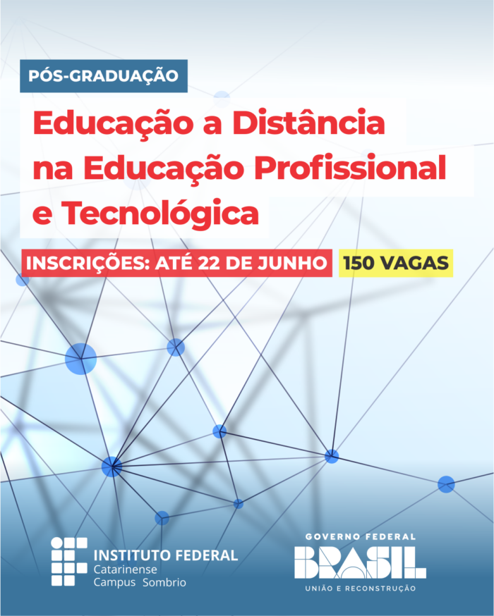 *Prorrogadas até 6 de julho as inscrições para a primeira turma da pós-graduação, do Instituto Federal Catarinense – IFC Sombrio, em Educação a Distância na Educação Profissional e Tecnológica. Com oferta de 150 vagas, o curso de especialização lato sensu da Universidade Aberta do Brasil (UAB) é totalmente gratuito e será realizado na modalidade EaD. Quem tiver interesse deve se inscrever por meio do portal público do Sistema Integrado de Gestão de Atividades Acadêmicas – SIGAA do IFC.