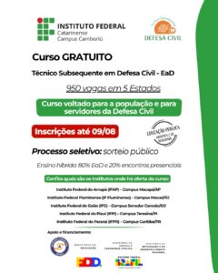 Cinco Institutos Federais (IFs) do país estão com as inscrições abertas, até 09/08, para o curso GRATUITO de Técnico Subsequente em Defesa Civil, na modalidade Educação a Distância (EaD). Coordenado nacionalmente pelo Instituto Federal Catarinense (IFC) – Campus Camboriú, o curso é pioneiro no Brasil e o único técnico subsequente em Defesa Civil credenciado pelo Ministério da Educação (MEC). Desde 2015, o IFC Camboriú oferta o curso, que agora ganha abrangência nacional.