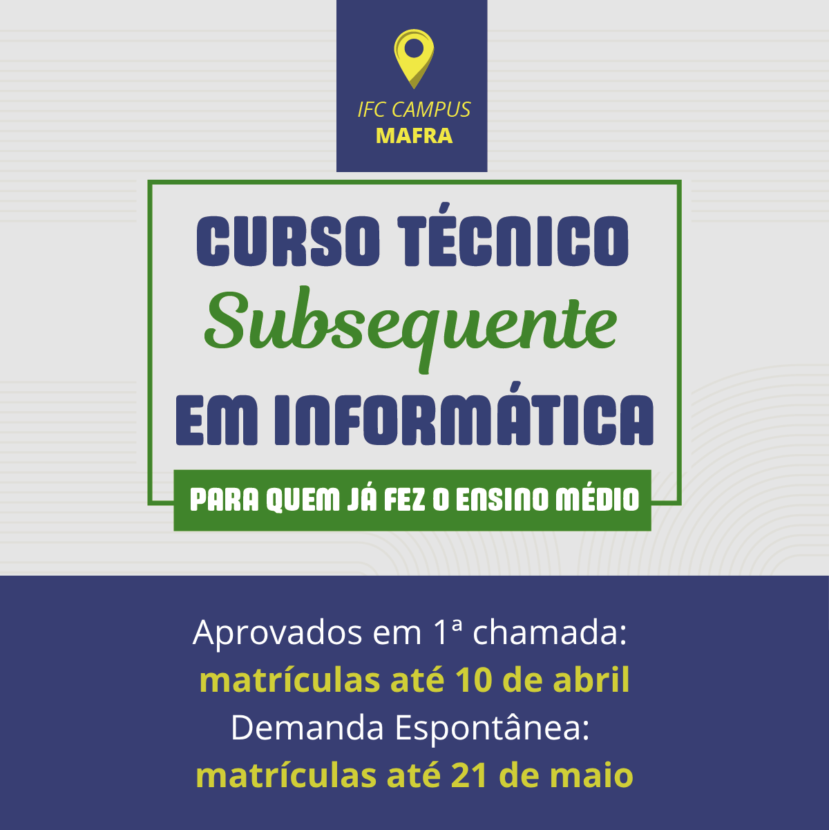 Mesmo com o fim do processo seletivo e a abertura das matrículas dos aprovados, ainda é possível ingressar no Curso Técnico Subsequente ao Ensino Médio em Informática do IFC no Campus Mafra. Há 11 vagas disponíveis por meio dos Editais de Demanda Espontânea do Instituto; o prazo para matrícula vai até 21/05.