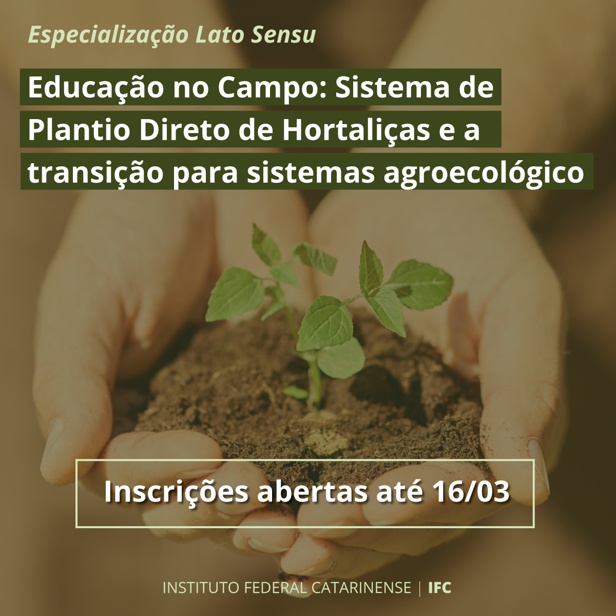 As inscrições para o curso de Especialização Lato Sensu em “Educação no Campo: Sistema de Plantio Direto de Hortaliças e a transição para sistemas agroecológicos”, ofertado pelo IFC no Campus Rio do Sul, estão abertas até o dia 16 de março. O edital do processo seletivo (e sua retificação) está disponível no seguinte link:
