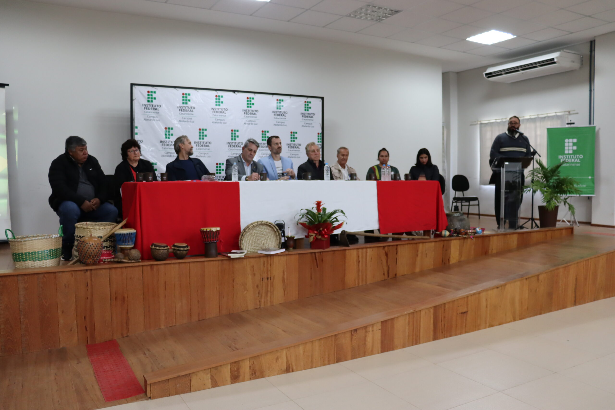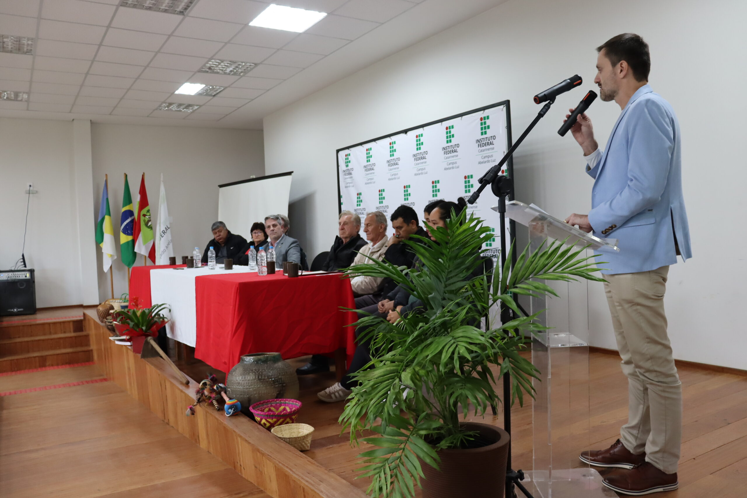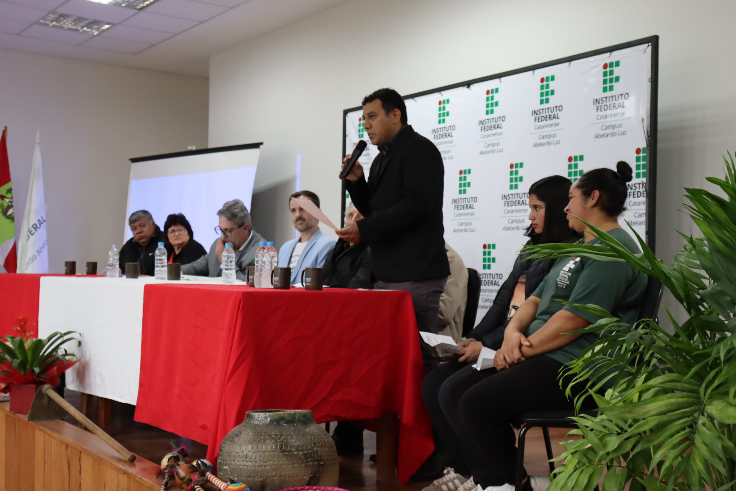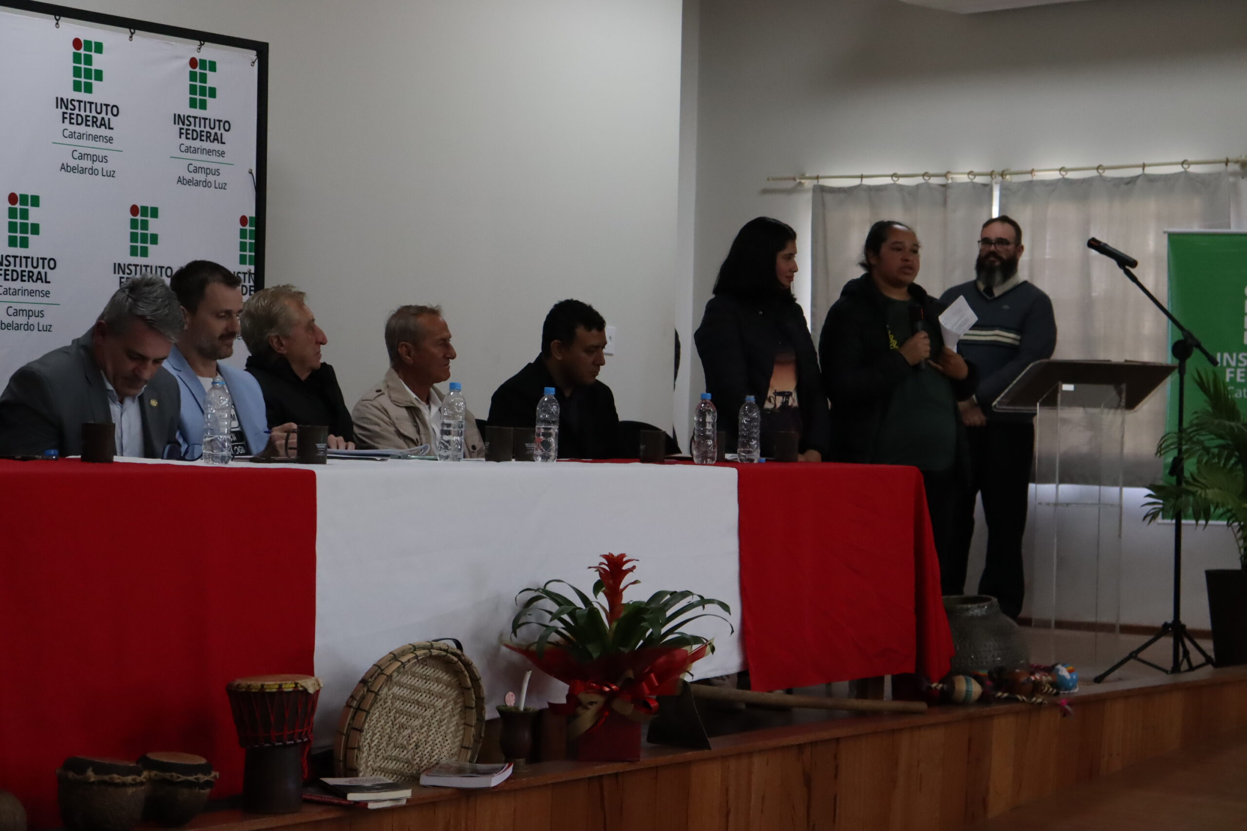 Entre os diversos convidados, a cerimônia contou com discursos das estudantes representantes da comunidade acadêmica; das lideranças dos povos indígenas e do Movimento Sem Terra; da presidência da Câmara de Vereadores e do prefeito de Abelardo Luz; do deputado Federal Pedro Uczai; do secretário da Setec/MEC, Marcelo Bregagnoli e do reitor do IFC, Rudinei Kock Exterckoter.
