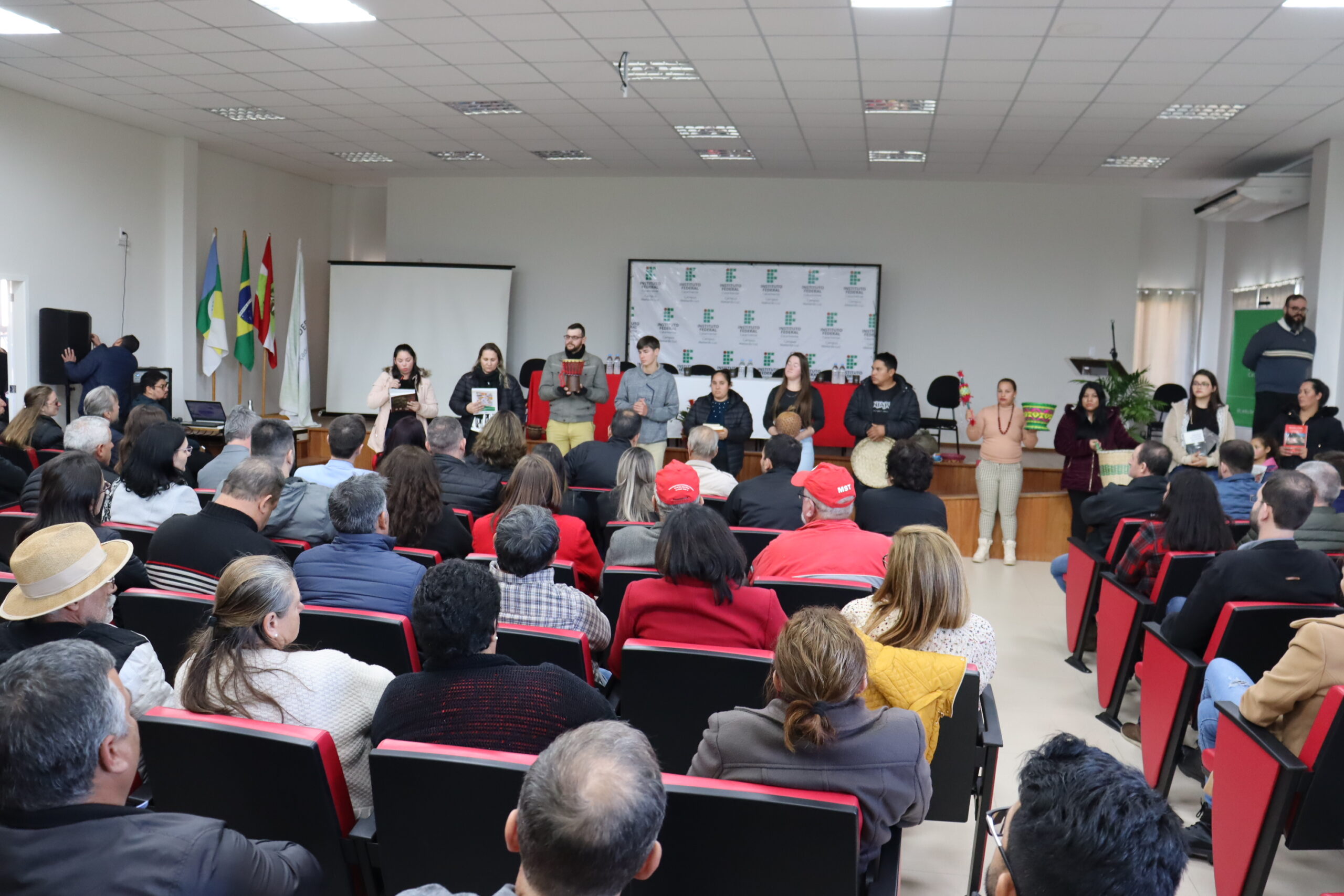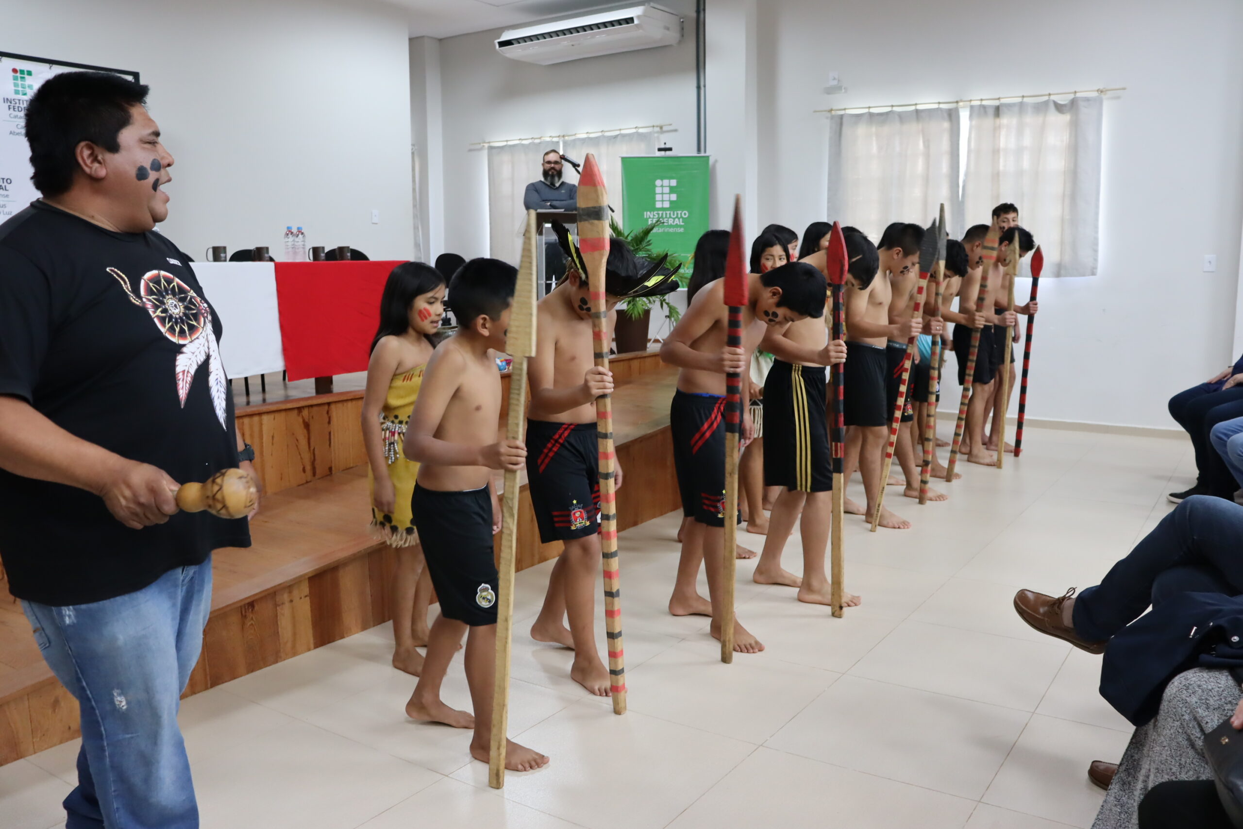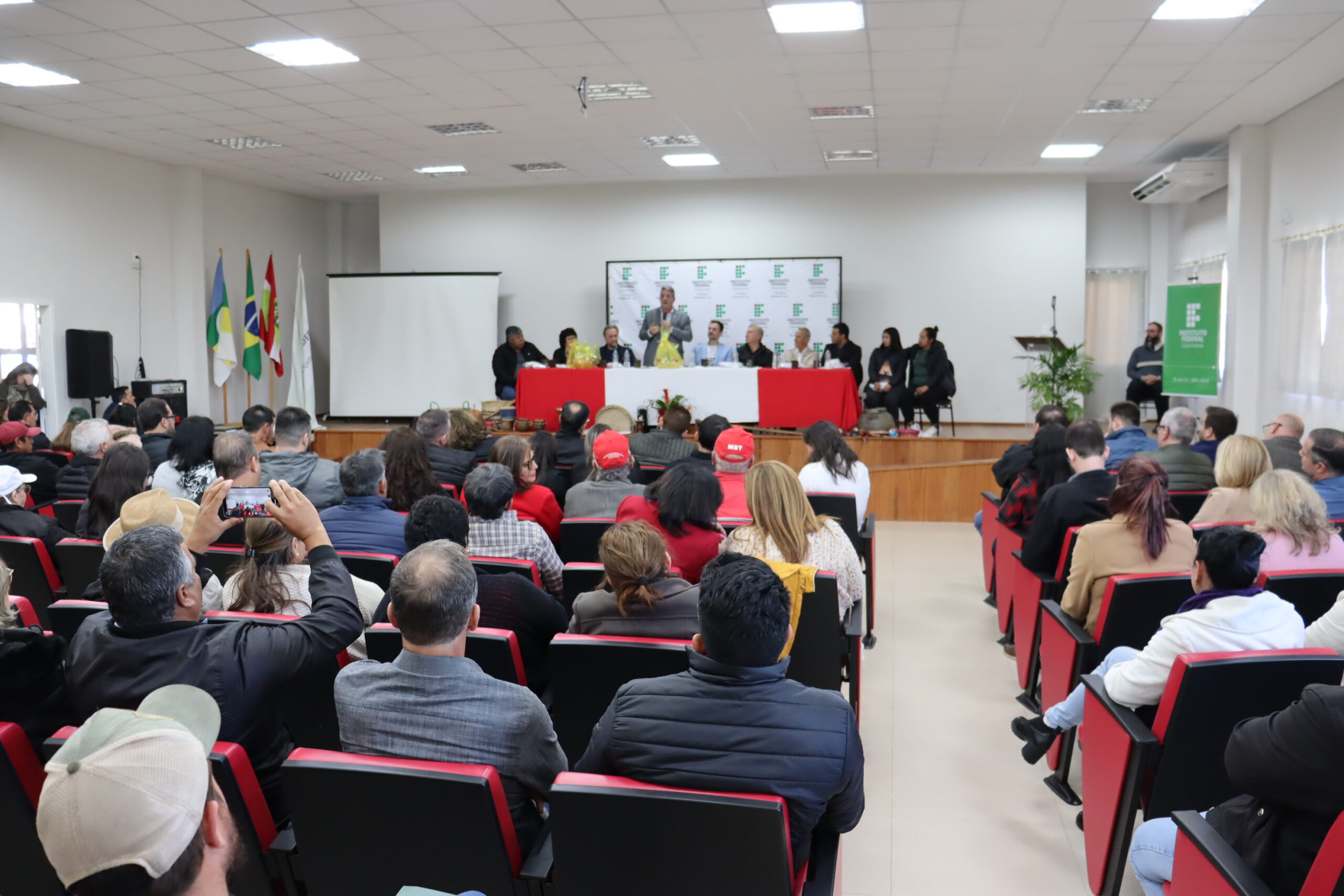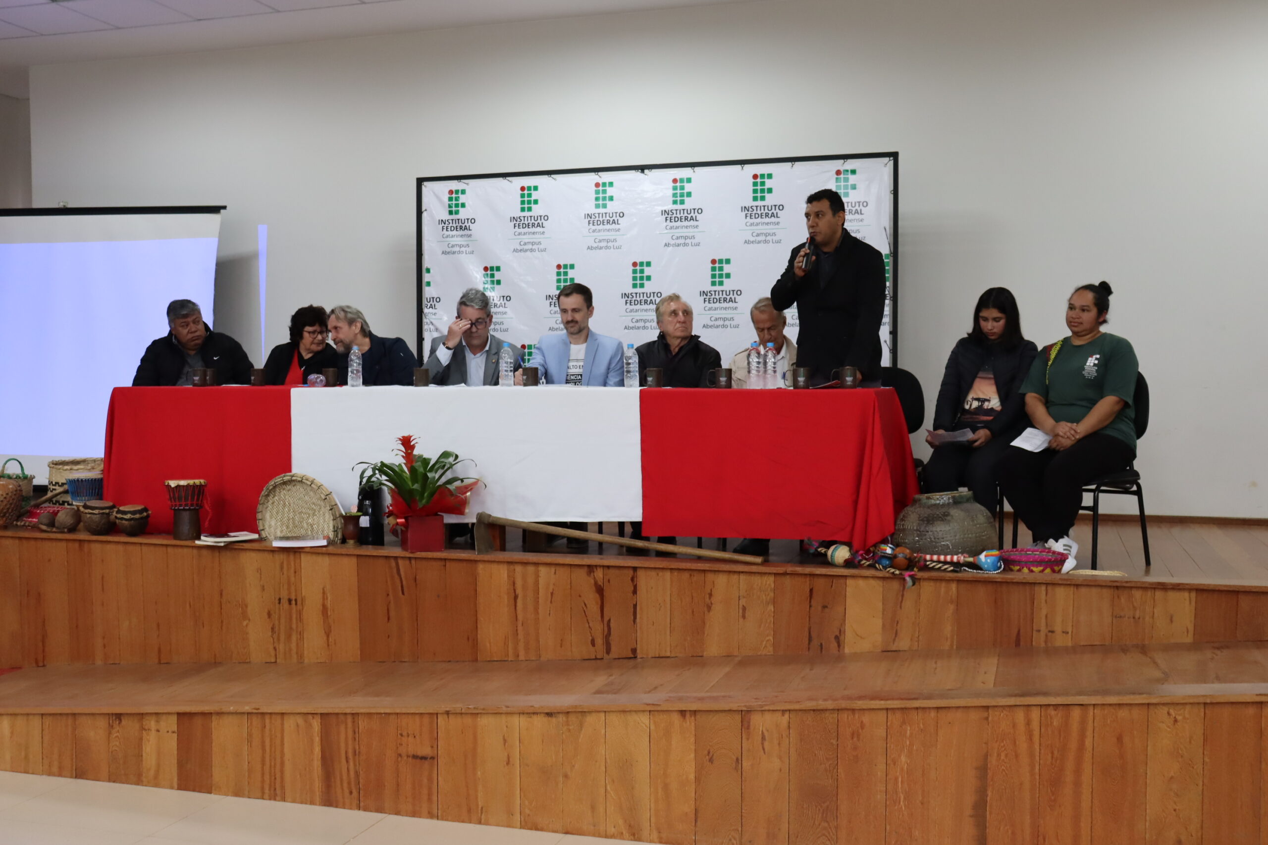 Entre os diversos convidados, a cerimônia contou com discursos das estudantes representantes da comunidade acadêmica; das lideranças dos povos indígenas e do Movimento Sem Terra; da presidência da Câmara de Vereadores e do prefeito de Abelardo Luz; do deputado Federal Pedro Uczai; do secretário da Setec/MEC, Marcelo Bregagnoli e do reitor do IFC, Rudinei Kock Exterckoter.