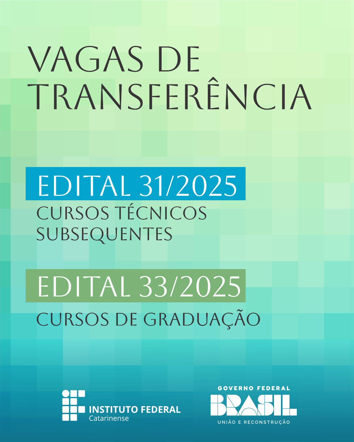 Instituto Federal Catarinense (IFC) está com inscrições abertas para processo seletivo de transferência interna e externa, reintegração e ingresso de diplomados, com vagas para cursos técnicos subsequentes (para quem já terminou o ensino médio) e também para cursos de graduação, ambos com início das aulas no segundo semestre de 2025.
