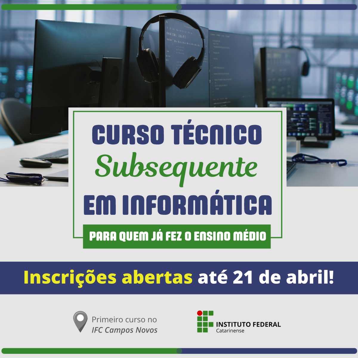 Estão abertas as inscrições para o Curso Técnico Subsequente ao Ensino Médio em Informática do campus do IFC em Campos Novos. São 40 vagas, sendo 20 para Ampla Concorrência e 20 para o Sistema de Ações Afirmativas (cotas), com ingresso no primeiro semestre letivo de 2026. O curso é o primeiro ofertado pelo IFC na nova unidade.