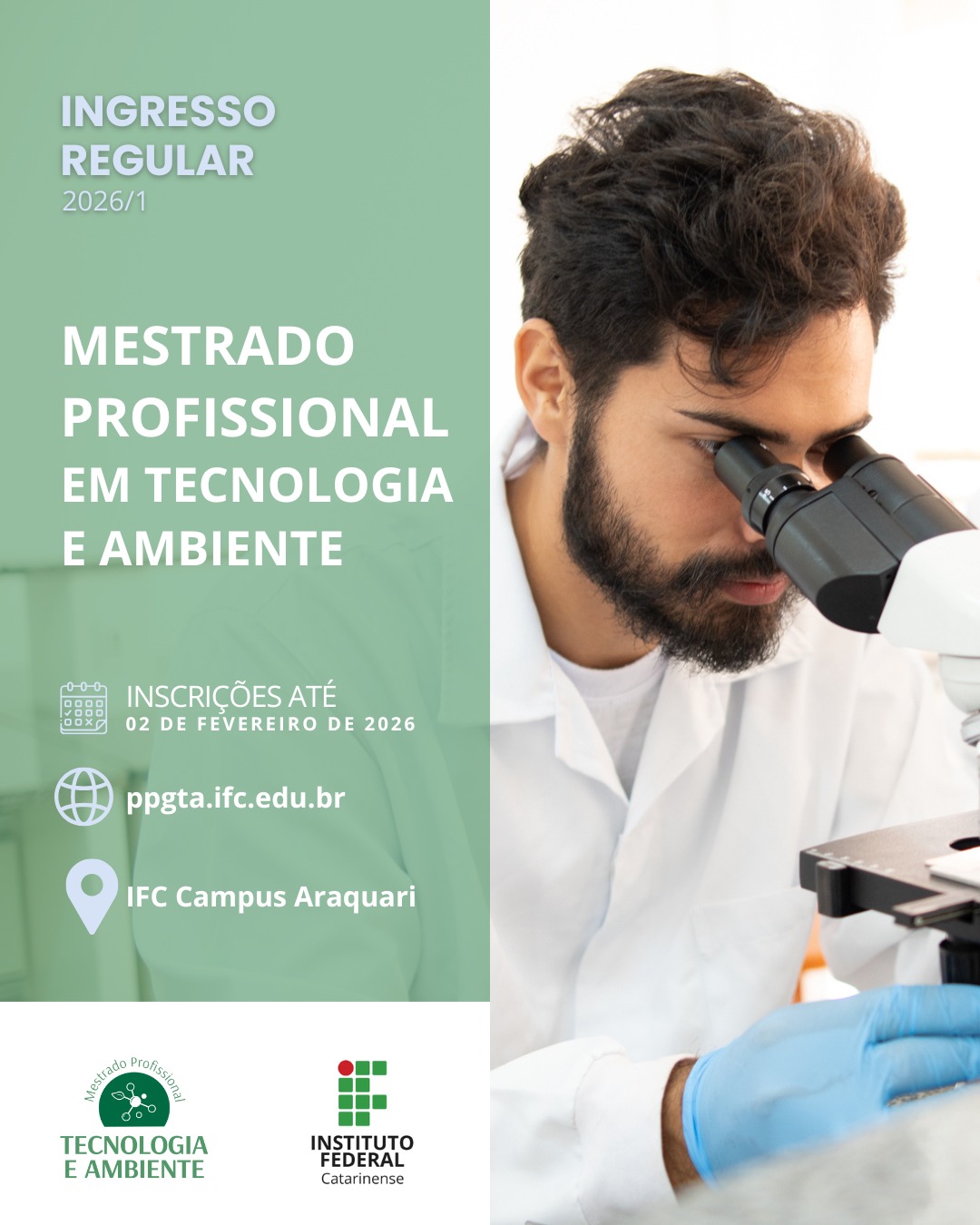 As inscrições para a seleção de estudantes regulares para curso de Mestrado Profissional do Programa de Pós-Graduação em Tecnologia e Ambiente (PPGTA) do IFC, ofertado no Campus Araquari, tiveram início nesta segunda-feira (17), e seguem abertas até 2 de fevereiro de 2026. A seleção oferece 12 vagas, voltadas para profissionais com graduação em Ciências Agrárias, Ciências Biológicas, Ciências da Saúde, Ciências Exatas e da Terra, Ciências Humanas, Ciências Sociais Aplicadas e Engenharias.