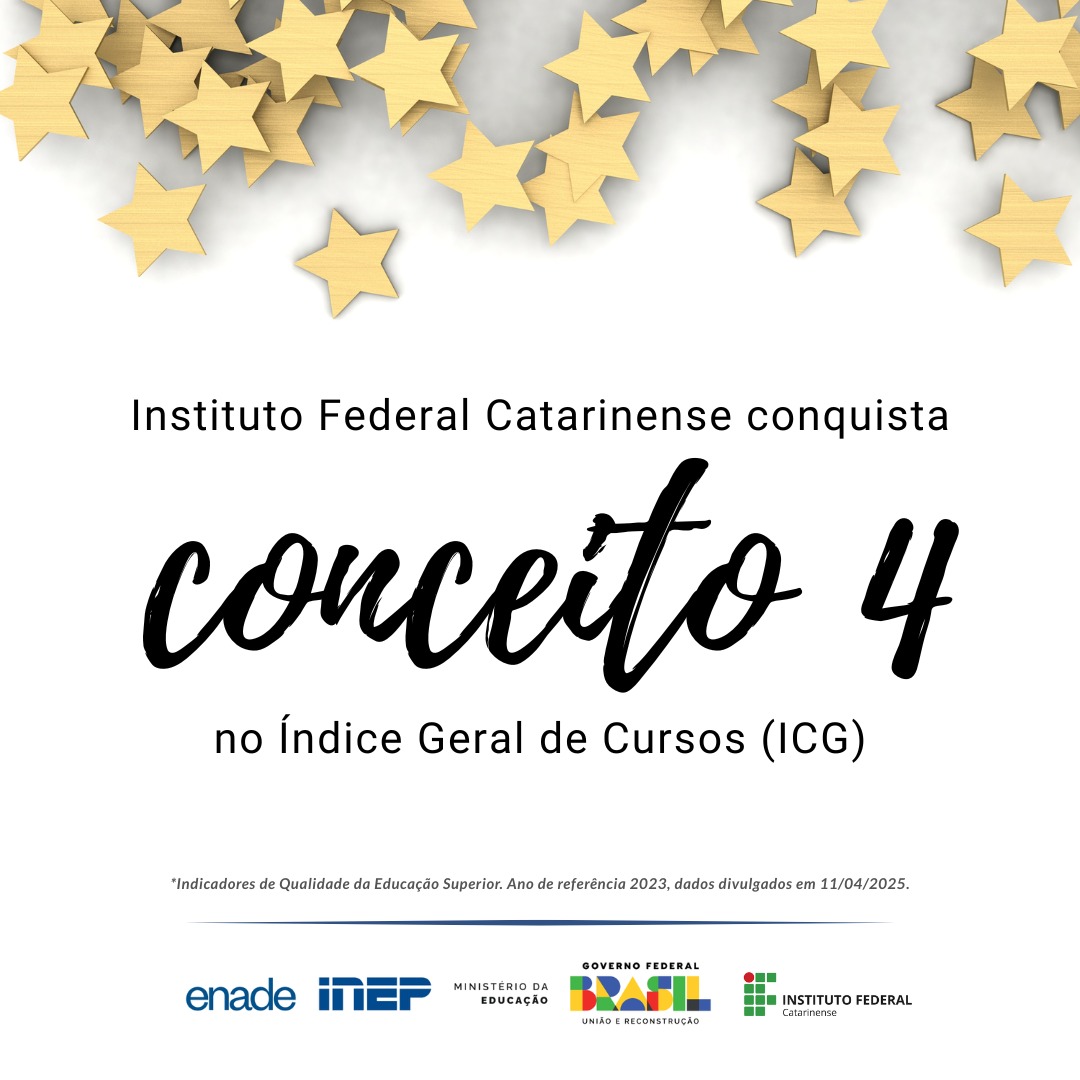 O IFC obteve, mais uma vez, conceito 4 — em uma escala de 1 a 5 — no Índice Geral de Cursos (IGC) do Instituto Nacional de Estudos e Pesquisas Educacionais Anísio Teixeira (INEP), figurando assim entre os 11% de melhores instituições de ensino superior do país.
