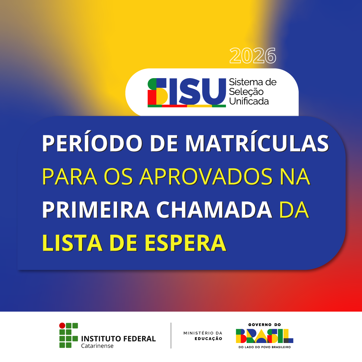 As matrículas para aprovados na primeira chamada da lista de espera do Sistema de Seleção Unificada (Sisu), para cursos de graduação no Instituto Federal Catarinense (IFC), começam nesta terça-feira (3) e seguem abertas até quinta-feira (5). A lista de candidatos(as) aprovados(as) está disponível no link abaixo: