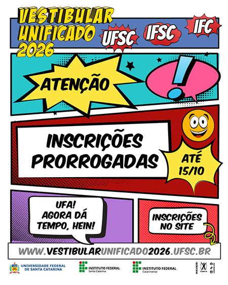 Fique ligado: o período de inscrições para o Vestibular Unificado UFSC/IFSC/IFC foi prorrogado! Agora, o procedimento pode ser feito até o dia 15 de outubro.